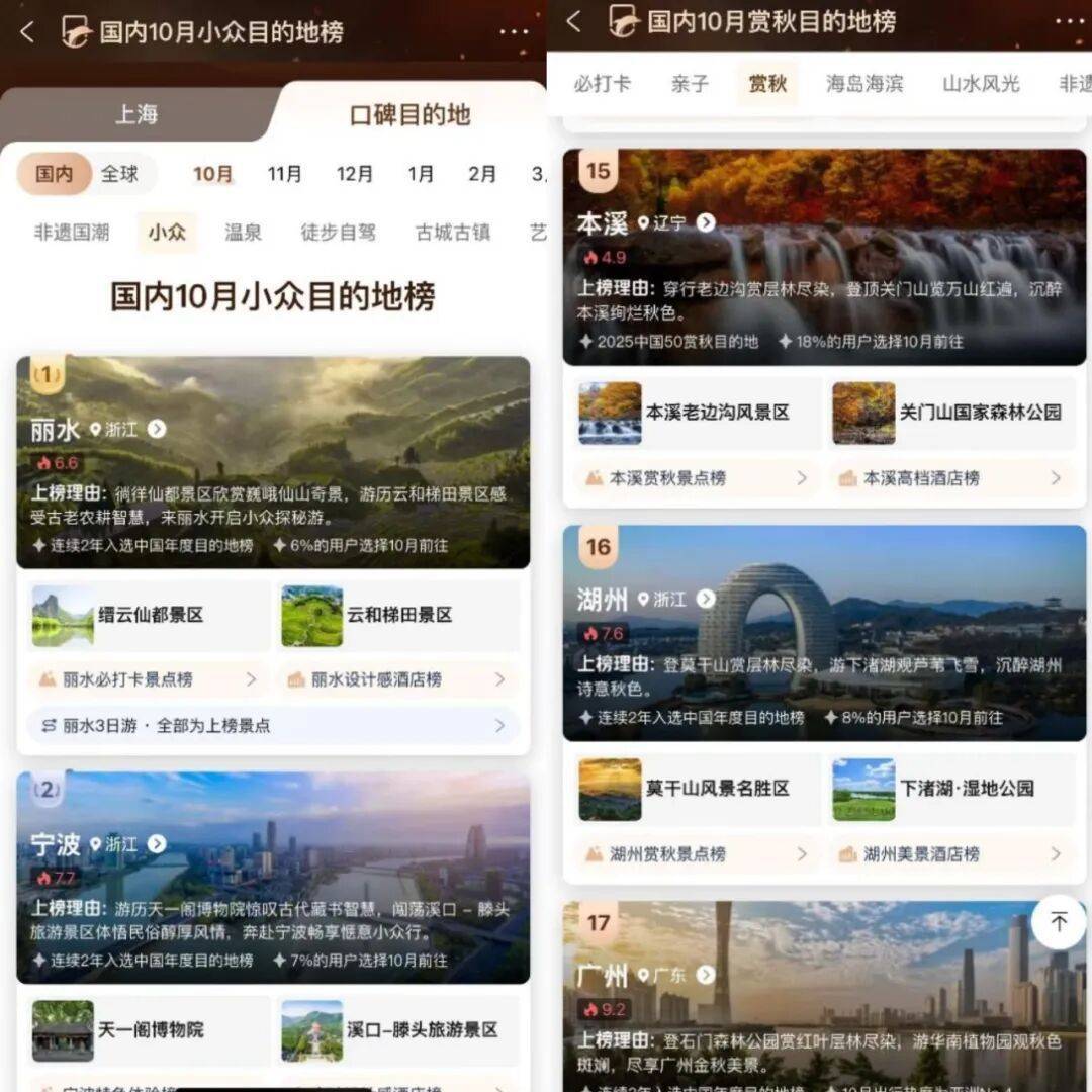 同样入选小众榜单的沿海城市也可以说是“名气不大、体验饱满”,惠州双月湾的半月形海面与巽寮湾原生态渔家文化,让这里连续入选年度目的地榜;宁德霞浦的“塞尔达”式海岛与太姥山“一线天”奇观,把福建的南国山海一次性打包,携程平台数据显示仅有5%用户表示10月会前往,却拥有江西境内最高的特色体验景点总数占比。这些“低热度、高评价”的特质,使它们成为口碑榜剔除人潮后仍能保证体验质量的优选。携程口碑榜负责人指出,通过数据算法与真人验榜的交叉验证,能够把“值得去”与“去得值”同时呈现给用户。